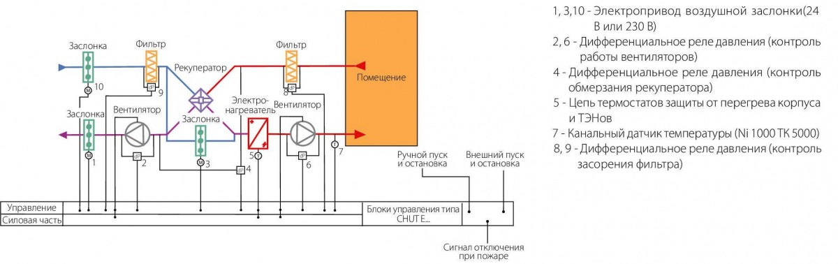 Блок управления CHUT-E9-10 предназначен для управления приточно-вытяжной установкой вентиляции с нагревателем приточного воздуха электрического типа (электрическим воздухонагревателем - калорифером).